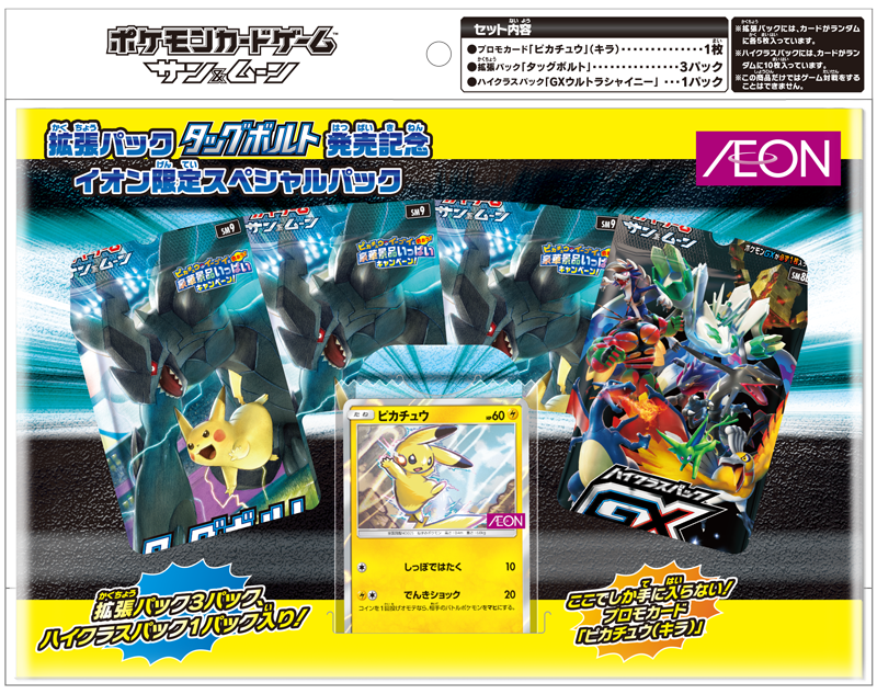 拡張パック「タッグボルト」発売記念 イオン限定スペシャルパック 発売日 2018年12月 7日(金) 価格 1,100円(税込) 詳細 プロモカード「ピカチュウ」(キラ)×1枚 拡張パック「タッグボルト」×3パック ハイクラスパック「GXウルトラシャイニー」×1パック 収録カード一覧・相場推移 ピカチュウ 拡張パック「タッグボルト」発売記念 イオン限定スペシャルパック -- PSA10 10,000円 前日比 0% 7日比 --